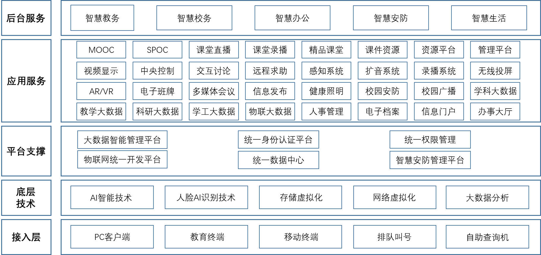 “智慧教育”是技術(shù)與教育的融合,對教學、科研、管理、技術(shù)服務(wù)、生活服務(wù)等校園信息的收集、處理、整合、存儲、傳輸和應(yīng)用,使數(shù)字資源得到充分優(yōu)化利用,利用傳感技術(shù)、大數(shù)據(jù)、物聯(lián)網(wǎng)、網(wǎng)絡(luò)技術(shù)、人工智能、虛擬現(xiàn)實等技術(shù),拓展和提升傳統(tǒng)教育的工具和方式,實現(xiàn)情境感知、學習分析、決策支持等教育服務(wù)。